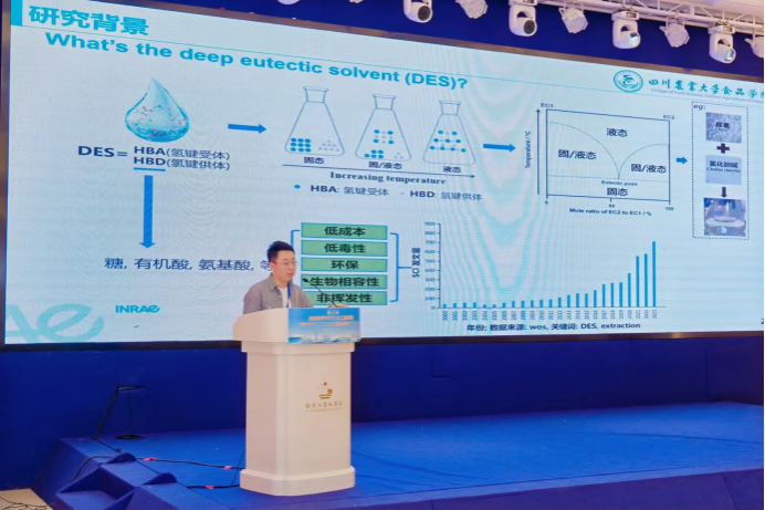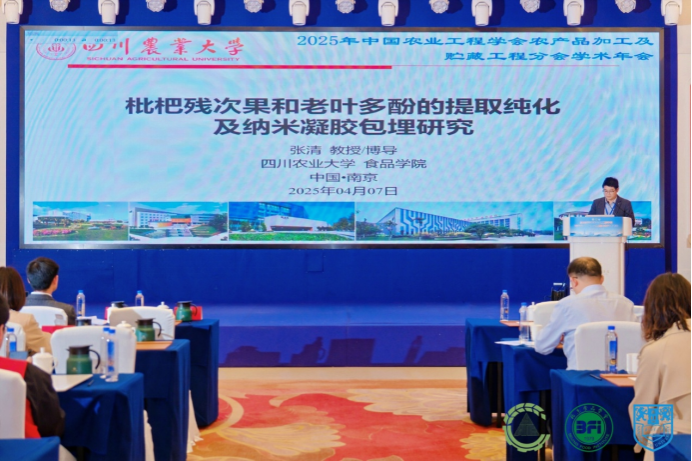 张清、陈明睿分别在“产品贮藏保鲜与生物技术”与“农产品初/精深加工技术及装备”分会场做了“枇杷残次果和老叶多酚的提取纯化及纳米凝胶包埋研究”和“基于天然低共熔溶剂预处理的苹果渣果胶梯次生物精炼”的汇报。汇报内容以低共熔溶剂助力农产品加工副产物高值化利用为主旨,开展了枇杷残次果/老叶、苹果渣中活性成分的生物精炼及后续应用。农产品采后处理及未来食品科技研究团队在绿色提取技术赋能植物功效成分高值化利用领域开展了大量研究,取得了阶段性成果。